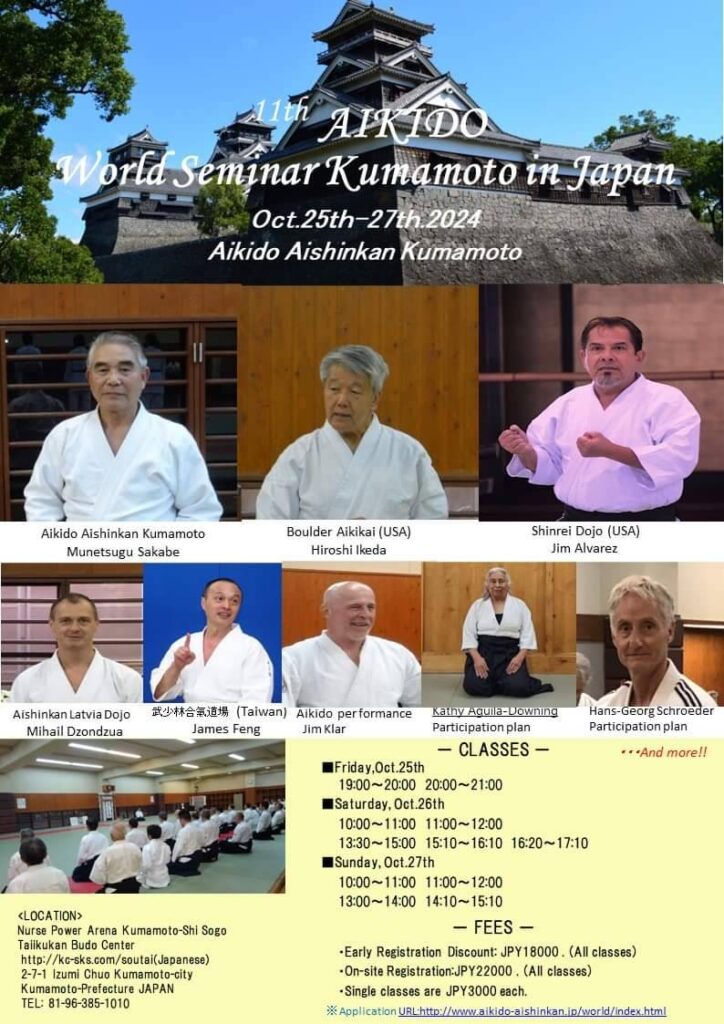 2024日本熊本合氣道研習 July 6, 2024 | No Comments 日期:20204/10/24-29 地點:日本熊本(從台灣出發) 歡迎大家私訊【台灣合氣會】臉書粉絲專頁,一起報名參加! 令和6年10月25日(金)~27日(日)まで熊本にて第11回目となる合気道国際セミナーを開催の予定です。今回もアメリカ、ヨーロッパ、トルコ、オーストラリア、台湾、香港をはじめ世界各地より参加が予想されます。この機会にセミナーを通じ合気道の精神と技を磨き、世界中の合気道家と親交を深めましょう。多数のご参加をお待ちいたします。 Workshop